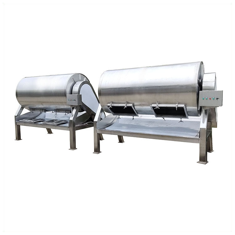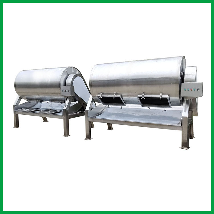 博瑞機械滾揉機槳葉圓弧形,設計獨特,工藝復雜,使腌料分布均勻,對產品表層不造成傷害,使產品的柔嫩性和外觀得到提高。本機是在真空狀態下,利用物理沖擊原理,讓魷魚片或魷魚條、肉餡等在滾筒內上下翻動,相互撞擊、摔打,從而達到按摩、腌漬作用。腌漬液被產品充分地吸收,增強產品的結合力及彈性,提高產品的口感及斷面效果;可以增強保水性,增加出品率;可以改善產品的內部結構,通過我們廠家生產的大小型真空滾揉機能使產品體蛋白質分解成水溶性蛋白,易被人體吸收,真空腌制機具有肺呼吸功能,讓產品在滾筒內膨脹,縮小了往復運動,改善了產品組織的結構,提高了切面效果。電機變速箱、真空泵、電器部件均采用國家知名品牌,以確保整機質量。